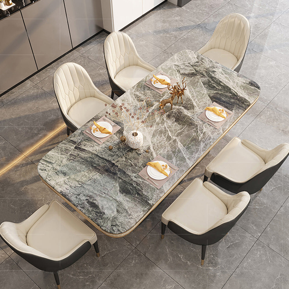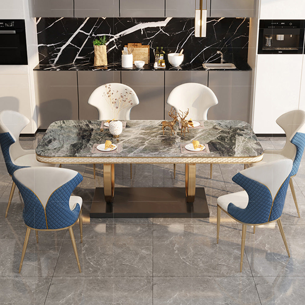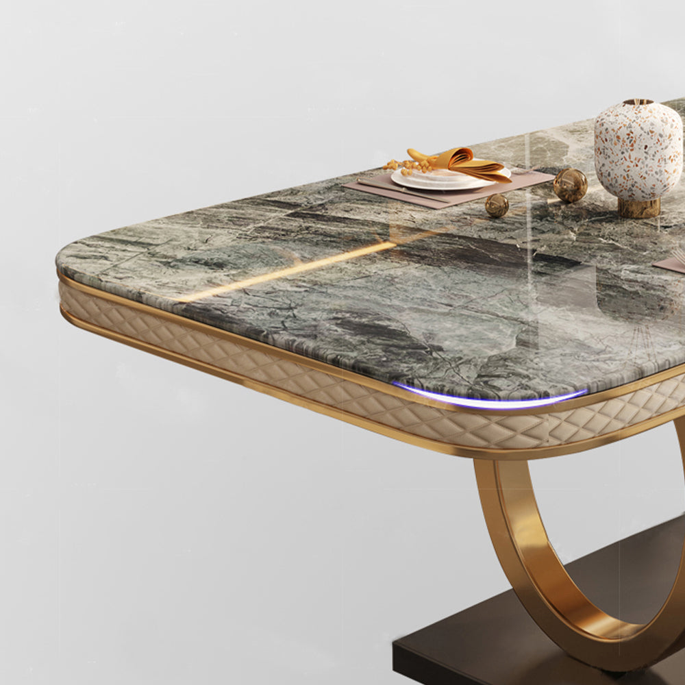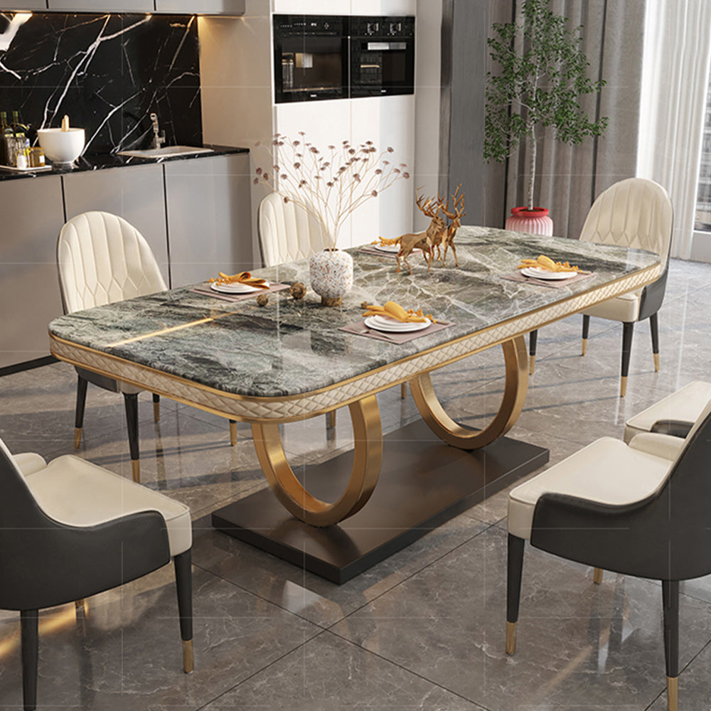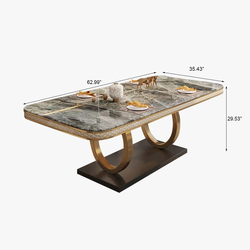 63" Modern Gray Rectangular Sintered Stone Dining Table with Gold Dual-Circle Base