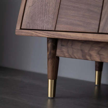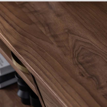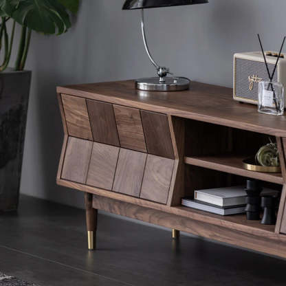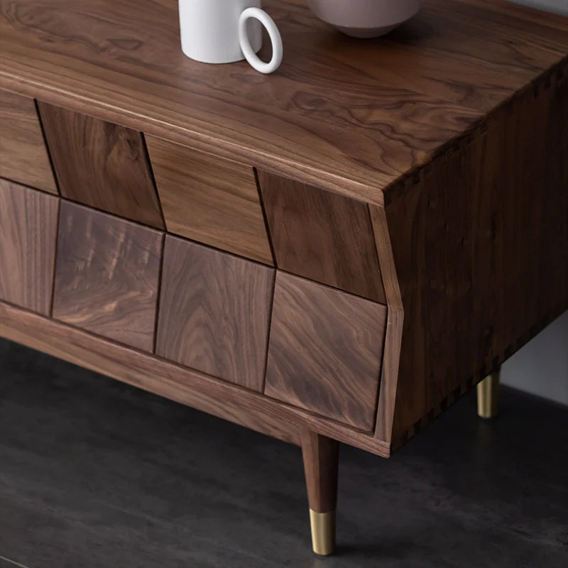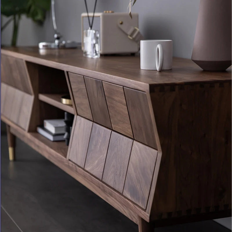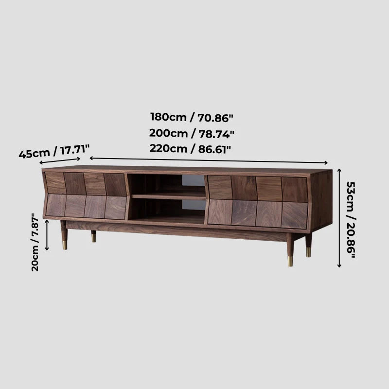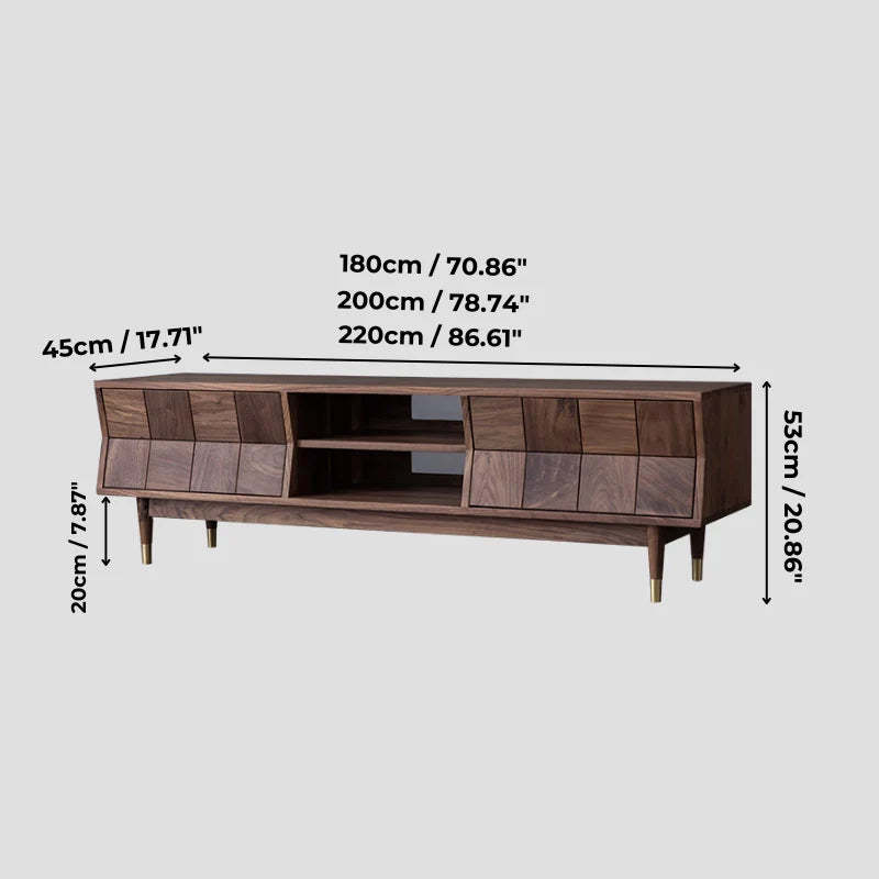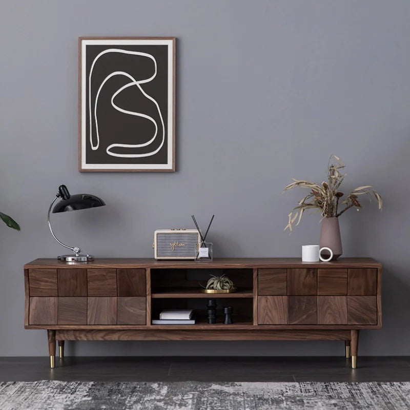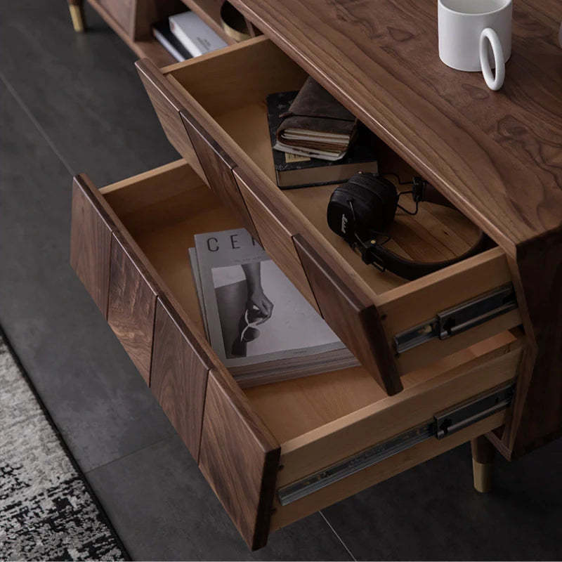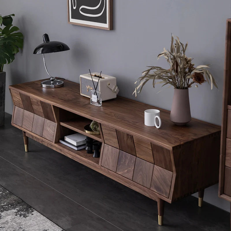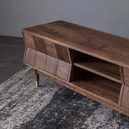 Mid Century Modern TV Stand - Concave Shaped Solid Walnut Wood with Open Shelf & Drawers